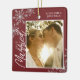 Este adorno navideño cuadrado es un regalo perfecto para la pareja recién casada. El diseño presenta un marco fotográfico con texto escrito a mano "Casado" y se acentúa con copos de nieve grises claros sobre un fondo rojo oscuro. Personaliza con una foto de la pareja, sus nombres y año.