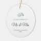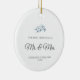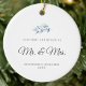 Una elegante rama de follaje de invierno en azul hielo y pintado en acuarela es la delicada decoración de este delicado y elegante adorno navideño para una pareja recién casada con el título "nuestra primera Navidad como Sr. y Sra.". Moderno, sencillo y elegante.