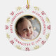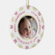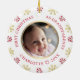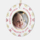 Este original ornamento de cerámica de Navidad cuenta con un festival de copo de nieve y diseño de bayas con fotos y oro falso. Personalízalo con una foto y tu texto. Esta plantilla funciona mejor con fotos en formato de paisaje con el bebé en el centro.