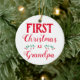Dice "Primera Navidad como abuelo" en un moderno tipo de letra roja con un fondo blanco. El otro lado tiene una foto del personalizable del bebé, con nombre y fecha de nacimiento.