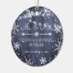 Primero Navidad, Mr. y Mrs. elegante adorno personalizado de árbol de keepsake con copos de nieve y luces de cuerda colgantes blancas en un oscuro fondo de madera azul marino. ++++++++++ Un regalo de bonito para recién casados.