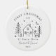 Marque sus primeras vacaciones en una nueva dirección con este ornamento cerámico blanco y redondo limpio. Una escena de invierno minimalista -pinos, una casa acogedora, luna creciente, estrellas y un pequeño ciervo- se sienta debajo del titular arqueado "PRIMERA NAVIDAD AT". Las líneas de abajo sostienen su calle, nombres y año por un recuerdo atemporal. El diseño en blanco y negro combina con cualquier decoración y se ve hermoso en árboles, cajas de regalos o puestos de exposición, perfecto para los nuevos propietarios de casas y regalos de la casa.
