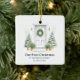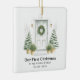 Un cálido adorno de cerámica redonda blanca con una suave acuarela en la puerta principal con corona, verduras machacadas y lámparas cálidas. El titular en la parte de abajo dice "PRIMERA NAVIDAD EN," con líneas debajo para tu calle, nombres y año. La suave paleta verde sabio se adapta a cualquier árbol y hace un delicioso obsequio de primera casa o un regalo de bienvenida. Actualice la dirección, agregue nombres y establezca el año para una pieza atemporal que colgará cada diciembre.