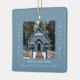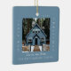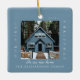 Mínimo y moderno simple foto mantener nuevo ornamento de fotos en casa para conmemorar su primera Navidad en nuestro nuevo hogar. El diseño presenta un diseño sencillo y mínimo con un diseño de fotos cuadradas para mostrar su nueva foto especial. "Nuestra primera Navidad", año y nombre de la familia se muestra en un sencillo diseño moderno alrededor de la foto. Dos adornos fotográficos con una foto en un lado y otra en el otro lado del adorno.