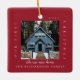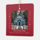 Mínimo y moderno simple foto mantener nuevo ornamento de fotos en casa para conmemorar su primera Navidad en nuestro nuevo hogar. El diseño presenta un diseño sencillo y mínimo con un diseño de fotos cuadradas para mostrar su nueva foto especial. "Nuestra primera Navidad", año y nombre de la familia se muestra en un sencillo diseño moderno alrededor de la foto. Dos adornos fotográficos con una foto en un lado y otra en el otro lado del adorno.