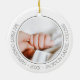 Primera Navidad Moderno Bebé Simple 2 Foto Nuevo Ornamento Cerámico Nacido maravillosamente muestra dos preciosas fotos de su recién nacido, una a cada lado del adorno. Alrededor de cada foto hay una línea de círculo delicada, con un texto negro personalizado que dice: "Mi primera Navidad - Año - Nombre del bebé", lo que lo convierte en un recuerdo eterno para los nuevos padres que celebran este hito especial. Una manera cuidadosa de conmemorar la primera temporada de vacaciones de su bebé, este adorno es perfecto para exhibiciones familiares o regalos a los abuelos. Añada las fotos, el nombre y el año especial de su bebé seleccionando "Personalizar esta plantilla" para un mantenimiento de vacaciones verdaderamente único. Para obtener más opciones de personalización, haga clic en "Editar usando la herramienta de diseño" para ajustar colores o tipos de letra para que coincidan con su decoración de vacaciones.