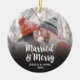 Un elegante guión blanco de la foto navidad adorna con las palabras: Casado y Feliz. Personalízalo con sus nombres, su fecha de boda y una foto. El mismo diseño en la parte delantera y trasera. Diseñado para ti por Blackberry Boulevard.