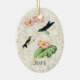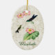 Ornament features a vintage illustration of the Purple-backed Thornbill hummingbird. An adult hummingbird with a dark purple back and metallic green throat, and a baby bird with speckled throat perch on a begonia plant with pink flowers, with a light gold marble texture background. Personalization options on front and back, or remove text for an elegant nature-inspired addition to any Christmas tree. Perfect all occasion gift for hummingbird lovers.
