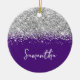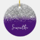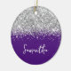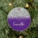 Personalizar el guión moderno de estilo manuscrito para crear tu propio ornamento de vacaciones de cerámica redonda personalizado. Añadir un primer monograma para crear una combinación inicial de nombre. Girly purpurina gris plateado sobre un fondo de color sólido personalizable morado. Los destellos y purpurinas son arte digital que se imprimirá como una foto.