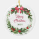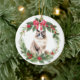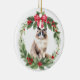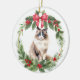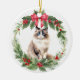 Este adorno Holiday presenta un hermoso retrato acuático de un gato de Ragdoll con ojos azules brillantes. La imagen del gato está enmarcada con una corona hueca y bayas rojas, con un brillante arco rojo en la parte superior. La parte posterior del ornamento tiene la misma corona de arco rojo, con dos campos de texto para su personalizar.