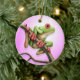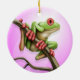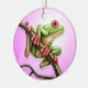 Una rana arbórea verde se encarama en una rama delante de un fondo rosa claro. La rana está mirando apagado a la derecha con una de él es ojos rojos brillantes visibles. Las manos rojas y los pies del pequeño individuo se envuelven alrededor de una rama marrón delgada que comience en la parte inferior del diseño y se levante y a la izquierda. Este diseño brillante y colorido hace un ornamento lindo y juguetón.