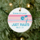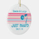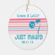 APENAS el diseño rayado lindo de MAUI'D es perfecto para que los recienes casados dejen el mundo saberlos acaba de estar casado en paraíso. Diseño azul y rosado del estilo retro de la raya con una palmera y un sol. El texto dice APENAS MAUI'D. Añada su propio año o mensaje personal. ¡Original de PinkInkArt!