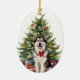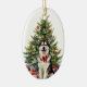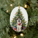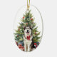 En la parte delantera de este adorno de vacaciones está la imagen de un hermoso perro malamute de Alaska con un arco rojo festivo. El perro se sienta frente a un árbol Holiday decorado. En la parte posterior, el texto rojo y verde dice MERRY CHRISTMAS", y hay campos de texto adicionales para que usted lo personalizar. ¡Haz que diga lo que quieras!