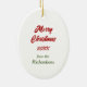 En la parte delantera de este adorno de vacaciones está la imagen de un perro negro Cocker Spaniel con un arco rojo festivo. El perro se sienta frente a un árbol Holiday decorado. En la parte posterior, el texto rojo y verde dice MERRY CHRISTMAS", y hay campos de texto adicionales para que usted lo personalizar. ¡Haz que diga lo que quieras!