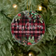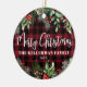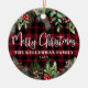 Celebrate the season with this cozy Christmas ornament featuring a bold red and black buffalo plaid background on the front. In the center, “Merry Christmas” is written in a mix of classic serif and script fonts, with your family name displayed just below. The year is printed beneath the name, making it a perfect keepsake to remember the season.