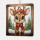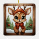 Un adorno cerámico cuadrado rústico de reno único cuenta con un marco de madera marrón, escena navideña con adorables crías de animales del bosque con cuernos en un estilo de arte gráfico de dibujos animados que llevan sombrero y bufanda, de pie en el primer plano. El fondo incluye árboles de Navidad invernales y paisaje nevado invernal, completando el encanto de la temporada navideña de esta ilustración de personaje de cierva de fauna silvestre de bosque, lo que la convierte en un gran regalo. Diseño de cervatillo en el frente y en la parte posterior. No importa cómo gire el adorno, siempre se ve festivo y completo.