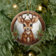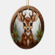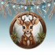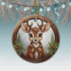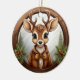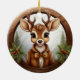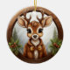 Este adorno navideño de renos presenta un marco redondo de madera marrón con bayas rojas de Navidad y hojas verdes que le confieren un aspecto rústico y acogedor. Dentro del adorno, un lindo animal bebé, venado con cuerdas, en un estilo gráfico personalizado, con una chaqueta marrón y corbata de arco, de pie en primer plano. Los pinos de fondo completan el encanto de las vacaciones de esta decoración única y deliciosa. La misma imagen está en la parte delantera y trasera. Esto garantiza que, independientemente de cómo se torne el adorno, siempre se ve festivo y completo. 🦌 🎄