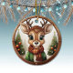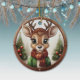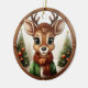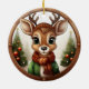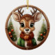 Este ornamento de reno está decorado con un marco redondo de madera marrón que le confiere un aspecto rústico y acogedor. Dentro del adorno, se despliega una escena de Navidades festivos con un lindo animal bebé, ciervo con cuerdas, dibujado en un estilo gráfico personalizado, con un suéter verde, un gorra y una bufanda de yeso, de pie en primer plano. El fondo incluye elementos suaves y inverosímiles como los árboles de Navidad y el paisaje de nieve de invierno lejano, completando el encanto de la temporada de vacaciones de esta encantadora decoración única. La misma imagen está en la parte delantera y trasera. Esto garantiza que, independientemente de cómo se torne el adorno, siempre se ve festivo y completo. 🦌 🎄