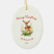 Feliz Navidad! Este lindo reno ha llegado para saludarte durante las vacaciones. La preciosa flauta tiene un brillante arco rojo y un follaje verde. El diseño tiene origen vintage, hecho en acuarela. El guión rojo del texto será editado por usted. Por favor, cambie los nombres y el año a los que desee.