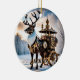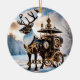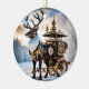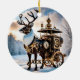 Este divertido diseño tiene un reno de vapor tirando de un carrito metalizado de ruedas.