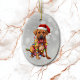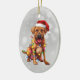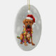 En la parte delantera de este adorno navideño hay una imagen de un perro Rhodesian Ridgeback que lleva un sombrero de Santa y envuelto en luces de Navidad de colores. La imagen está colocada sobre un fondo festivo de bokeh plateado. La parte posterior del adorno tiene texto en rojo, dorado y verde.