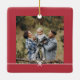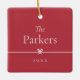 El adorno navideño es dulce y sencillo y tiene un diseño minimalista, con el nombre de su familia y el año en un estilo serif limpio y clásico sobre un fondo rojo festivo. Una pequeña proa a través del centro completa el diseño. Añade una foto al reverso, acentuada con un ilustracion de proa coincidente.