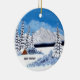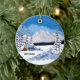Un adorno vacacional con una hermosa escena de invierno que incluye montañas cubiertas de nieve, verduras y cabaña rústica. Las imágenes y el texto se pueden personalizar, reemplazar o eliminar. Obra de arte original de W.B.