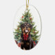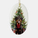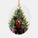 En la parte delantera de este adorno navideño está la imagen de un hermoso perro Rottweiler que lleva un lazo rojo festivo. El perro se sienta frente a un árbol navideño decorado. En la parte posterior, el texto rojo y verde dice "FELIZ NAVIDAD", y hay campos de texto adicionales para que puedas personalizar. ¡Haz que diga lo que te guste!