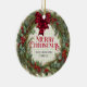 Añada el encanto de una casa de campo a su árbol con este adorno navideño con una corona de pino pintada a mano, eucalipto y bayas rojas enmarcando un centro de gingham verde suave. El fresco patrón de control de campo le da a esta pieza un ambiente acogedor de casa de campo, perfectamente adaptado a la decoración rústica de las vacaciones. Este adorno es un conservador atemporal que combina maravillosamente con las tarjetas de vacaciones de gingham. Personaliza con tus detalles para crear un tesoro único al estilo de una casa de campo que aportará calidez y alegría a tu árbol en los años venideros.