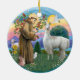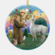 San Francisco, santo patrono de los animales y del medio ambiente, se muestra aquí en esta bella escena con una llama, cordero, conejo y paloma de la paz.
