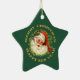 Este adorno vacacional tiene un toque nostálgico, con una imagen retro de Santa con su gorra de caldo rojo y blanco y su barba blanca. Él lleva un estribo de holly con una baya roja. El retrato está rodeado por una corona de agujas de pino sobre un fondo verde del bosque. El texto de oro purpurinoso en semicírculo en la parte superior dice Feliz Navidad, y en la parte inferior Feliz Año Nuevo. Ambos lados del adorno tienen la misma imagen y texto. *Atención: la imagen está impresa y no contiene purpurina real.*