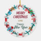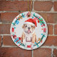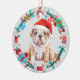 En la parte delantera de este adorno navideño hay una imagen de un adorable cachorro de Bulldog marrón y blanco con un sombrero de Santa. El perro está encerrado dentro de una corona de Navidades hecha de huesos envueltos, estrellas de oro, paquetes de regalo y luces de cuerdas. La parte posterior del adorno tiene la misma corona con texto personalizado en rojo, oro y verde. Cambia fácilmente el año a un nombre para personalizarlo, si quieres.