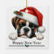 On this cute Holiday ornament, an adorable little Boxer Dog puppy winks at you from a red and white Santa Claus hat that is decorated with a holly and berry sprig. The text at the bottom front says "Merry Christmas". The same image is on the back, but the text that says "Happy New Year" is a custom text field that you may easily change to a name or a signature, if you'd like.