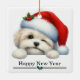 On this cute Holiday ornament, an adorable little white Havanese puppy winks at you from a red and white Santa Claus hat that is decorated with a holly and berry sprig. The text at the bottom front says "Merry Christmas". The same image is on the back, but the text that says "Happy New Year" is a custom text field that you may easily change to a name or a signature, if you'd like.