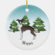 El original ilustracion personalizado de Destei de una linda foca color de abrigo marrón y blanco perro de raza Greyhound italiano. El perro es colocado en una escena invernal con tres abetos verdes y la caída de la nieve. El fondo es un degradado de azul a blanco que da al diseño ese aspecto frío del invierno. También hay un área de texto personalizable para un nombre u otro texto personalizado.