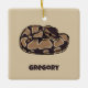 Este adorno navideño presenta un ilustracion de estilo realista de una serpiente pitón de bola en marrón oscuro y tostado. Está listo para ser personalizado con un nombre con letras marrones oscuras. Hace un gran regalo para los propietarios de serpientes mascotas.