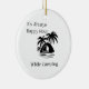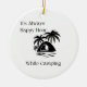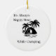 Siempre es Happy Hour mientras caminas con una foto de campamento en blanco y negro creada en un adorno navideño.