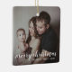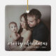 Añade un recuerdo a tu árbol con este moderno adorno de cerámica keepsake que presenta un diseño simple con el saludo, "Feliz Navidad" en tipografía de escritura blanca junto con tu nombre familiar y año sobre tu foto favorita. Añada la misma foto a ambos lados o a uno diferente a cada lado. Este adorno también es un gran regalo para amigos y familiares.