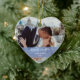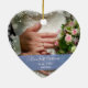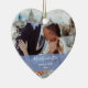Elegante, moda "Merrily ever after" / "Our First Christmas" (Nuestra primera Navidad) casada como Mr. y Mrs. con foto personalizada adorno de Navidad (en forma de corazón) para recién casados, con tipografía cursiva moderna y letras a mano en una banda azul semitransparente, y un marco de copos de nieve blancos y plateados y pequeñas estrellas. Asegúrate de personalizar las dos fotos, los nombres, el nombre de la familia y el año.