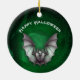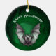 This hanging ceramic ornament has a spooky grey bat with wings spread in flight in front of a haunted glowing green cave. Customise the Happy Halloween text with the template.