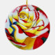 con diseño artístico original de la pintura acuarela de Sacha Grossel de la flor rosa de té híbrido rojo y amarillo contra fondo verde. Este diseño de arte contemporáneo y luminoso presenta un diseño macro floral de gran envergadura, con un motivo botánico, de un estilo luminoso, colorido para los amantes de las flores y los rosas.