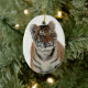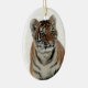 Adorable fotografía de retrato de un cachorro de tigre sentado en la nieve con un copo de nieve en la punta de su nariz. Adornos de Navidad.