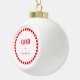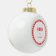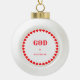 Hermoso adorno de Navidad de bola de cerámica con bendiciones rojas y blancas. Dios nos está bendiciendo que el texto está rodeado de corazones sobre fondo blanco.