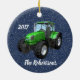 El tractor verde favorito de un granjero sobre un fondo azul es un adorno navideño fácilmente personalizado.