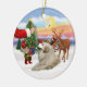Santa le ofrece una delicia a sus grandes Pirineos mientras un elfo ayuda a cargar el trineo.