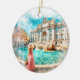 This customizable Christmas ornament features a watercolor style portrait of a woman throwing a coin into the Trevi Fountain in Rome, Italy.