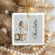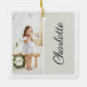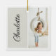 Un hermoso adorno de foto y nombre personalizado sencillo, minimalista y moderno para añadir un toque personalizado a su árbol de vacaciones familiar. El adorno presenta un diseño vertical de fotografía retrato con un fondo gris claro sencillo y personalizado con el nombre en la parte delantera y trasera para mostrar dos fotos.