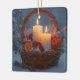 ¡Una canasta para el yule! Velas, rodajas de naranja en una cesta tejida de viñas. La vela ilumina la noche mientras la canasta se sienta en la nieve. Decoración de solsticio de invierno.
