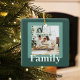 Celebra la calidez de la temporada con este moderno adorno navideño personalizado verde. Con una preciada foto familiar y una tipografía "familiar" blanca y limpia, este elegante adorno cerámico le da un toque significativo a su decoración de vacaciones. Un regalo atemporal para padres, abuelos, recién casados o tu propio árbol, es la manera perfecta de capturar recuerdos año tras año. Impresa en cerámica de alta calidad con un diseño cuadrado elegante y cuerda dorada para colgar.