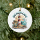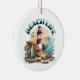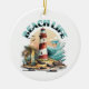 Ornamento navideño con temática playera. Ilustracion de una escena de playa con faro, tablas de surf, palmeras y delfines.